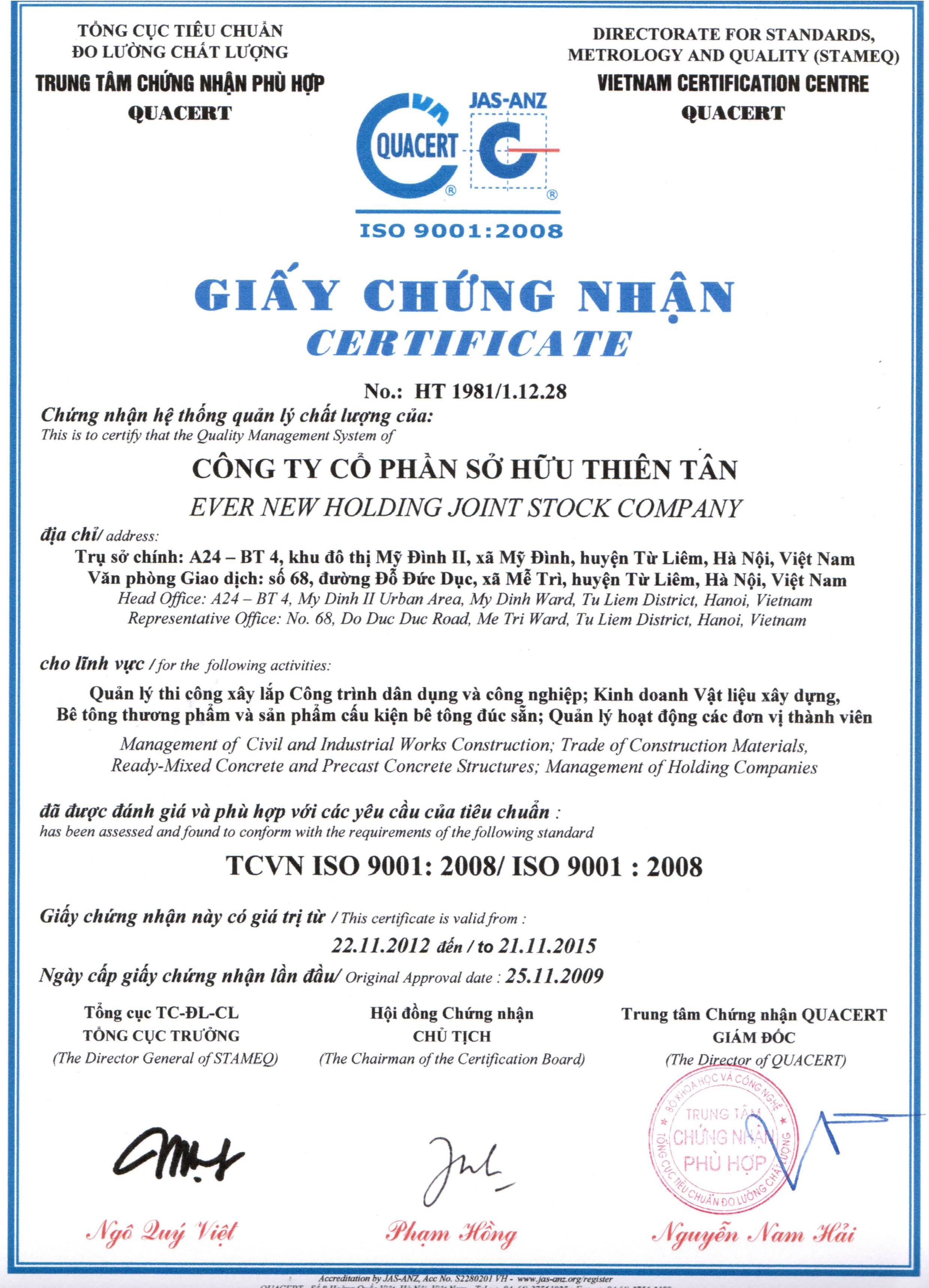 Ngày 22 tháng 11 năm 2012, công ty cổ phần sở hữu Thiên Tân hân hạnh được đón nhận Chứng chỉ chứng nhận hệ thống quản lý chất lượng.